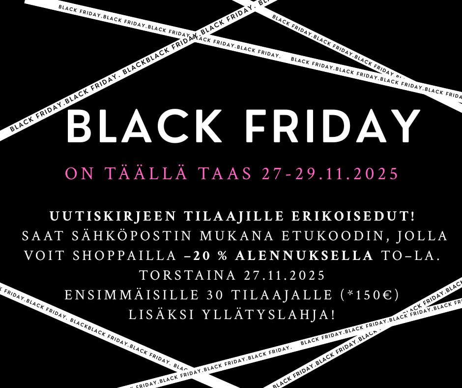 Ilmainen lahja 30 ensimmäiselle torstain shoppailijalle, kun ostoksesi arvo ylittää 150€. Uutiskirjeen tilaajana saat salaisen edun käyttöösi jo ennen Black Friday- viikonloppua - ennen muita. Seuraa postiasi!